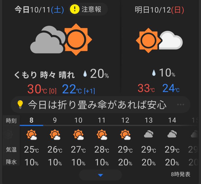 明日は33度げな。旧体育の日を過ぎたら涼しくなるはずなんだがなぁ pic.twitter.com/n782lzPV7u October 10, 2025